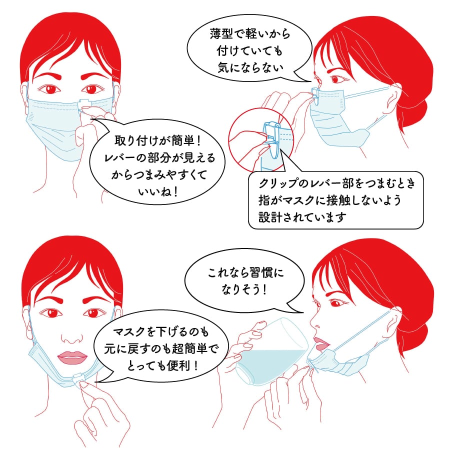 マスクの表面に触れずに口元を解放できるマスク用クリップ。
